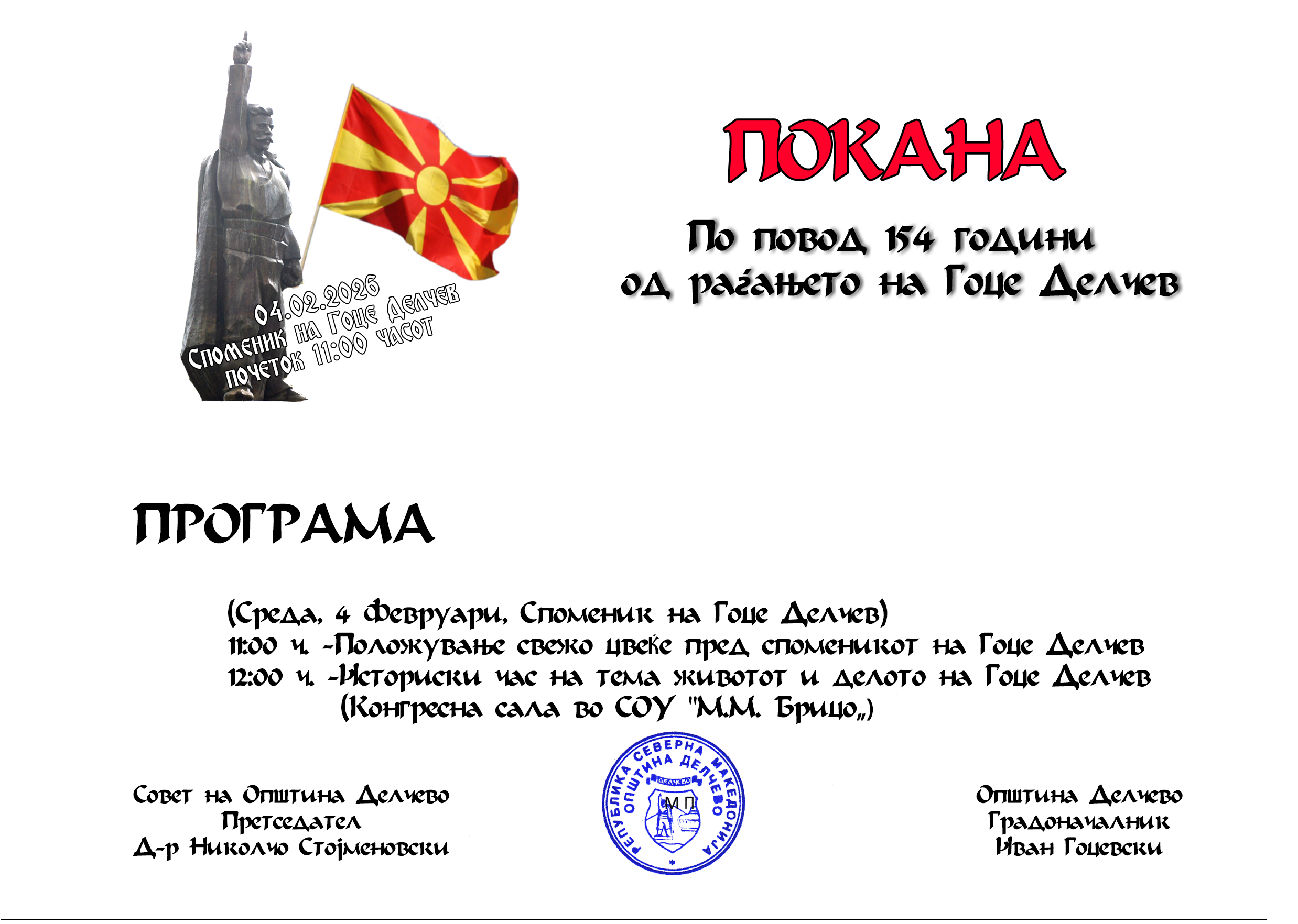 Новости февруари 3, 2026февруари 3, 2026 1ТП1 Покана за чествување на 154 години од раѓањето на Гоце Делчев Shares Прегледи: 36
